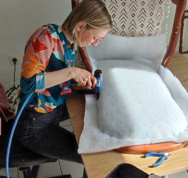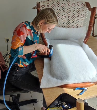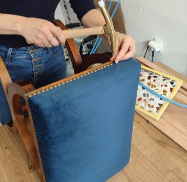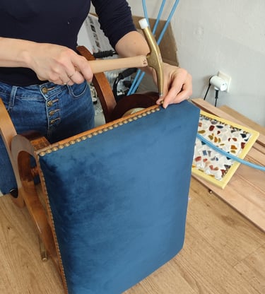 Chez Kosy Atelier Tapissier, nous apportons un soin particulier à la pose des clous tapissier et de la passementerie afin d'apporter la touche finale qui sublimera votre chaise, fauteuil ou canapé.